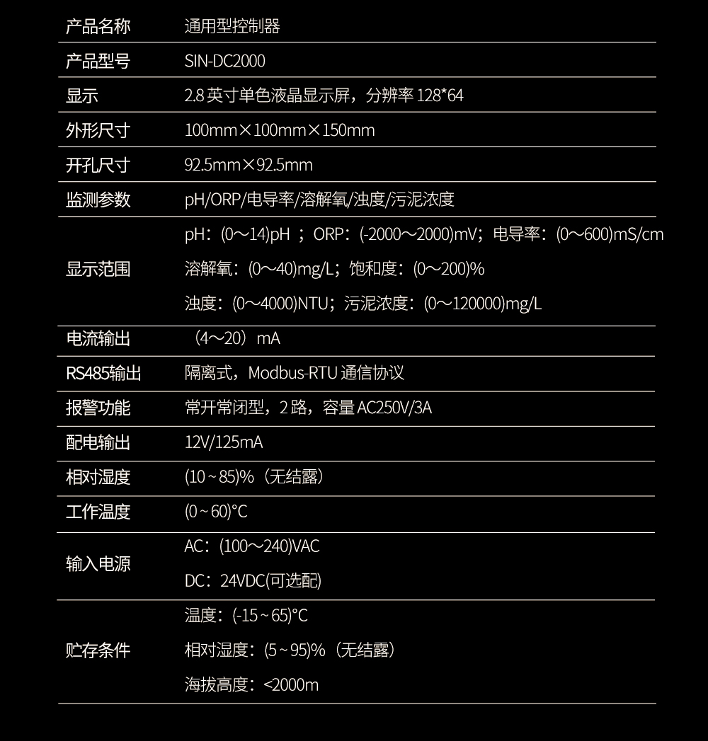 聯測儀表SIN-DC2000全功能控制器為水質通用型控制器,適用于與本公司多種水質系列數字傳 感器配套使用,用于監測包括 pH、ORP、電導率、溶解氧、濁度、污泥 濃度等水質參數,監測的參數通過 RS485 或電流變送輸出到監控室進行 記錄保存。