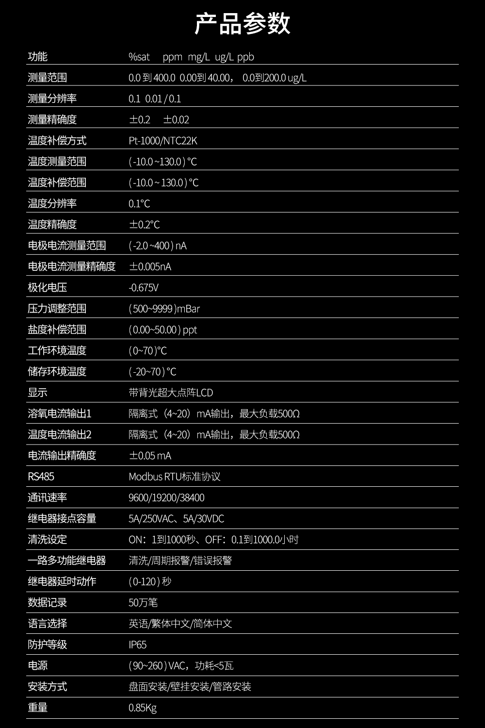 產品簡介:聯測SIN-DO8.0溶解氧在線分析儀是一款智能在線化學分析儀器之一,儀器用于工業上溶氧 %/ppm/mgL/ugL/ppb 及溫度的測量,如:發酵,飲用水,鍋爐水,海水,養殖,水族館,地表水,工業污水,都市廢水,環境監測,食品生產過程等。